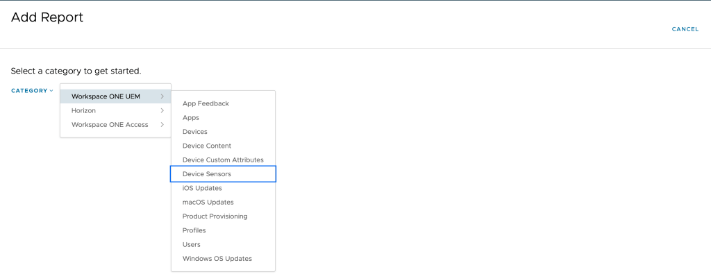 4. Select Category–>Workspace ONE UEM–>Device Sensors