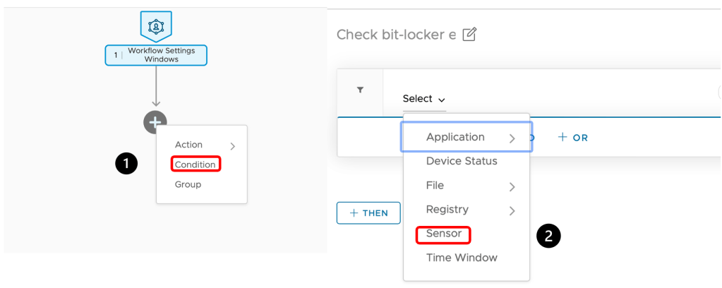 Select the Condition you would like to setup , we have selected Sensor here to detect if the device is in an encrypted state.