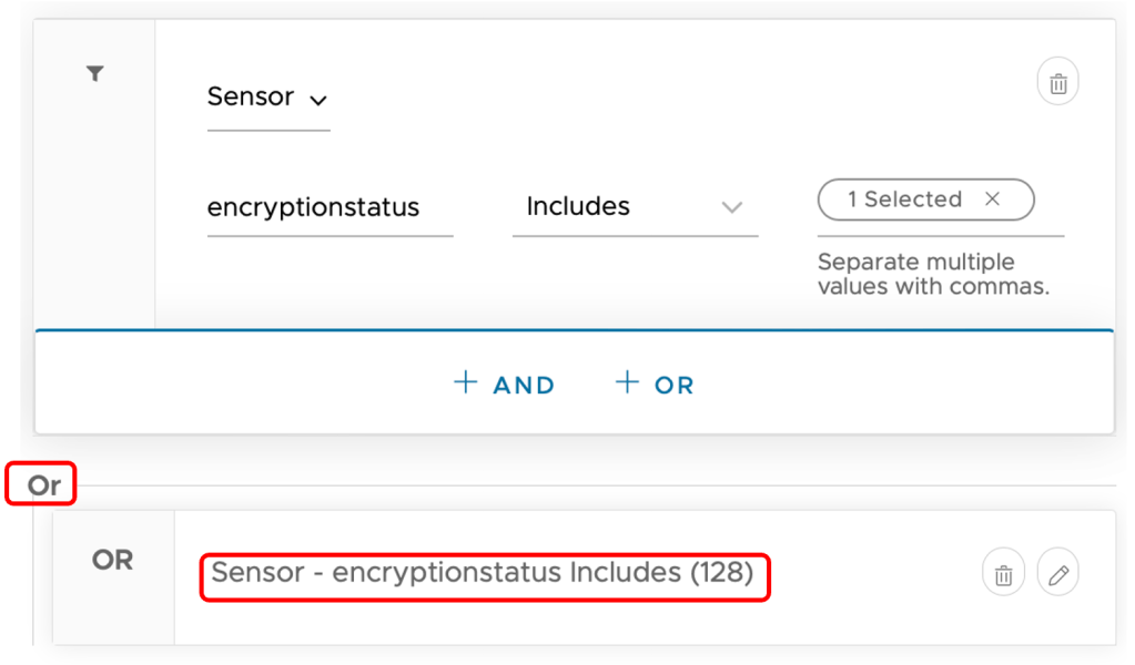 I have selected the OR operator as in our example here we are checking if the device is encrypted with either 256 or 128 bit encryption.